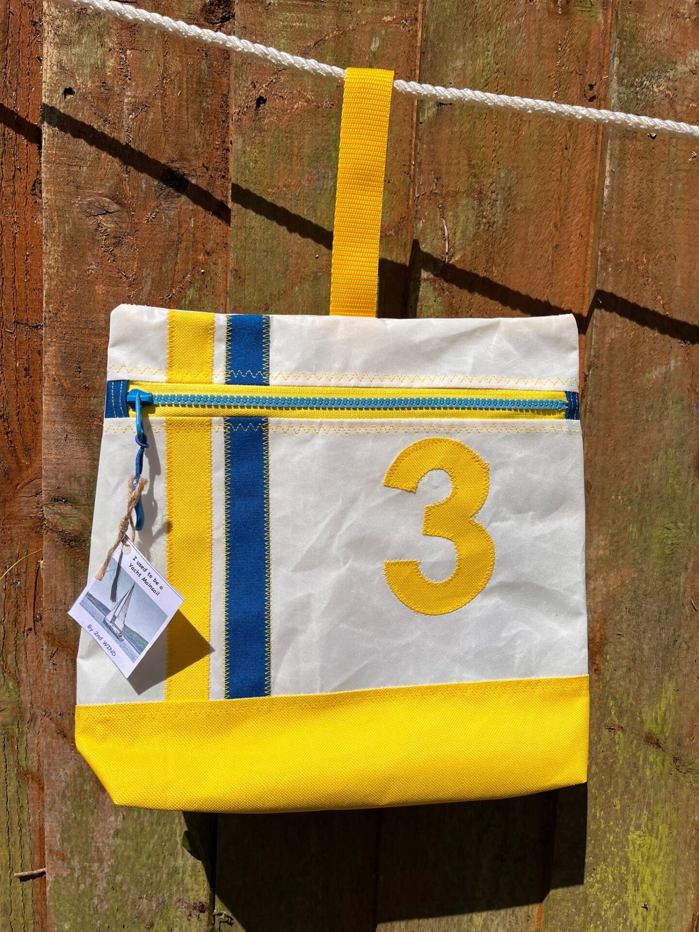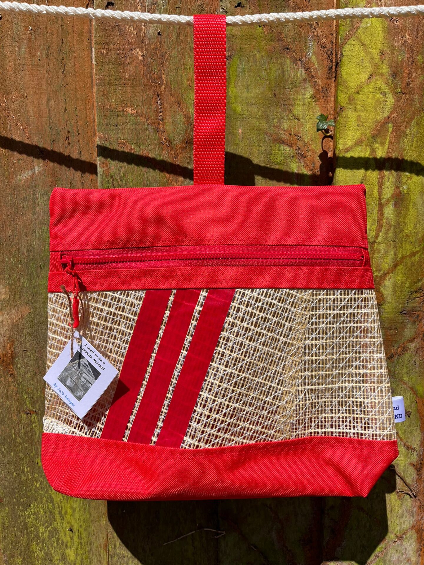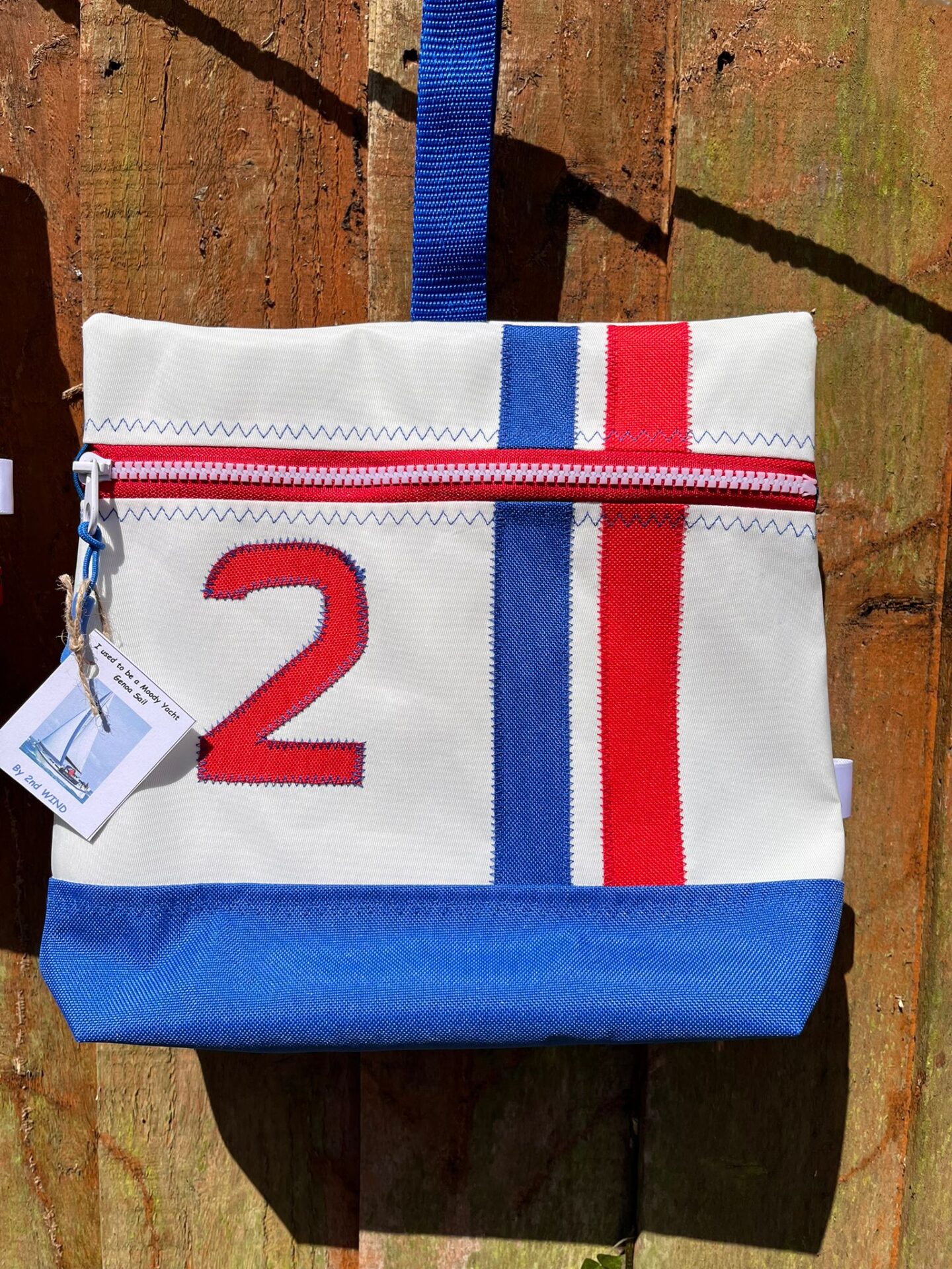This style of bag has been made using either windsurf, yacht or dinghy sail. Whilst these bags do not boast full waterproof properties, all are water resistant and due to being made from sail, they are incredibly fast drying if they do become wet. All seams are double stitched. Polypropylene webbing has been used for the carrying/hanging straps. In many designs webbing or insignia tape has been used to add a decorative effect to the finished product. These bags are 27cm wide at the top and 30cm across at the base, 26cm high and have a depth of 9cm tapering in at the top. Waterproof material has been used on the bases so they can stand in wet environments. These bags can all be machine washed at low temperatures.